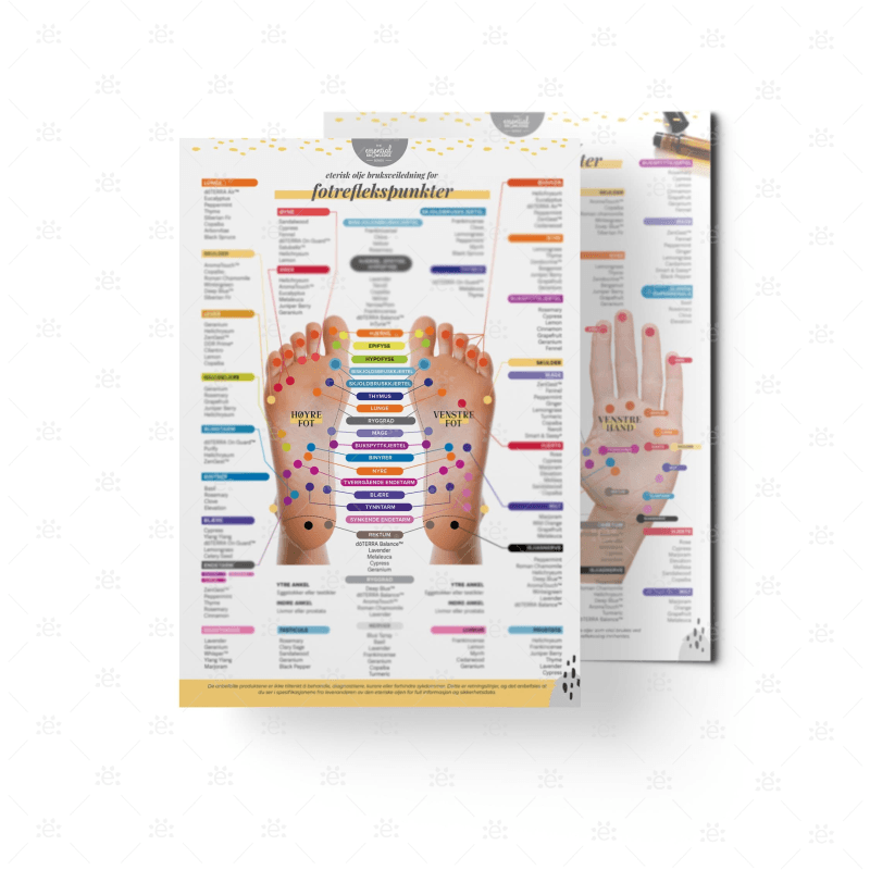 Part of the Essential Knowledge Series, this NORWEGIAN double-sided comprehensive foot and hand reflex point guide will aid you in selecting which oils to use on reflex points on both feet and hands.